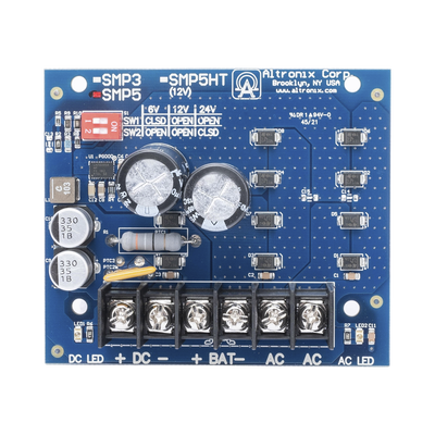 La fuente de alimentación / cargador SMP5 convierte una entrada de CA de bajo voltaje en una salida de 6 V CC, 12 V CC o 24 V CC. Esta unidad tiene una amplia gama de aplicaciones para accesorios de control de acceso, seguridad y sistemas de CCTV que requieren energía adicional.