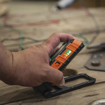 - Pie de apoyo que cuenta con potentes imanes para fijarla, y los tres agujeros para clavo y el mosquetón incorporado facilitan colgarla.