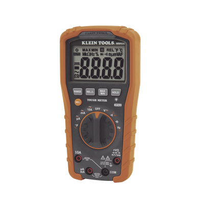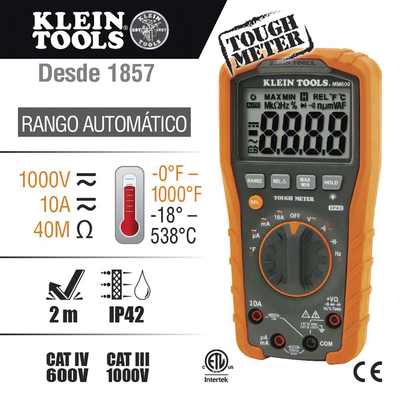 - Multímetro que mide voltaje de hasta 1000 V CA/CD, corriente de hasta 10 A CA/CD, resistencia de hasta 40 MΩ, temperatura, capacitancia, frecuencia y ciclo de servicio, y diodos de prueba y continuidad.